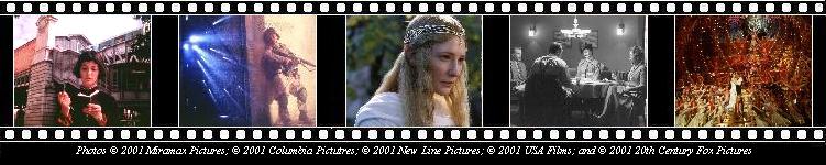 Has all the parti-colored appeal of Amélie but feels more homegrown, despite its Aussie crew. Moulin Rouge reigned as the year's biggest visual extravaganza for months and months until The Lord of the Rings, and its fans seem all the more eager to throw it some statues in the wake of Luhrmann's non-nomination. Lack of location shots means that the beautiful scenery is all McAlpine's work, not mother Nature's. |