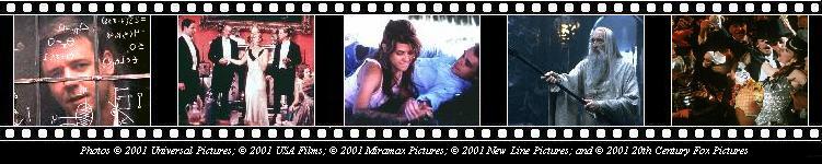 Like The Lord of the Rings, Moulin Rouge put the adventure and the optical extravaganza back in studio filmmaking and has amassed a dedicated legion of fans. It's the closest thing to a love story among the Final Five, and with a surprise Producers Guild Award to match its National Board of Review prize and its Golden Globe in the Musical/Comedy division (over Gosford Park), the film has appreciable awards momentum and support from all the Branches. Perhaps survives the downscaling to TV (i.e., Academy screener tapes) more easily than the grand vistas of Fellowship.